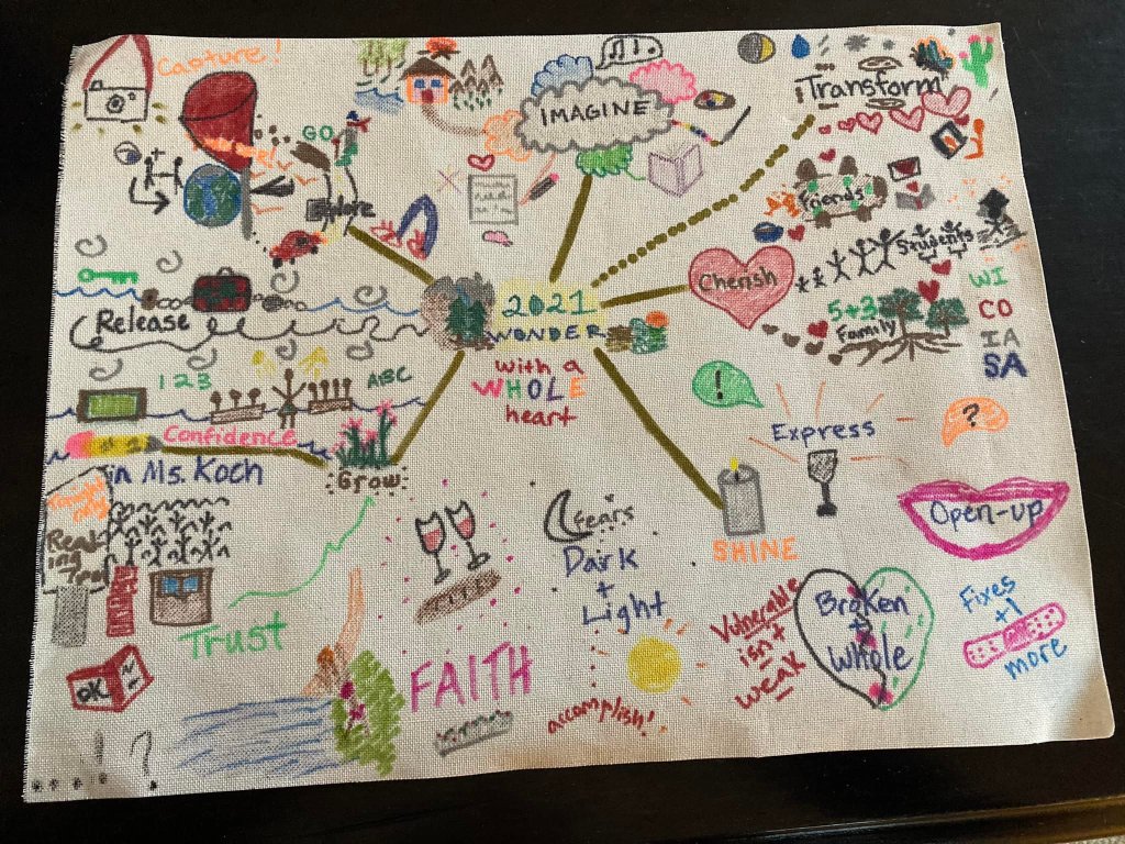 2021’s Intention was WONDER with a Whole Heart. Initially, I had planned for wholehearted. I reconsidered when I realized it could take all of my 30s to really unpack that in myself. This is probably my personal favorite because of all of the drawings with my words. I really spent time with this. Also, it niece, Ada, who was 2 and a half at the time, helped me color on the back.